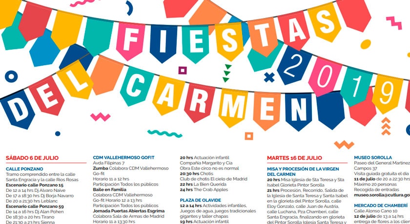 Con motivo de esta celebración, el distrito de Chamberí realiza diversas actividades dirigidas a todos los públicos, ahora en 2019 se celebran del 6 al 16 de julio. Si estás en Madrid estos días, te animamos a que participes y conozcas el distrito a través de sus fiestas. Esta es la programación