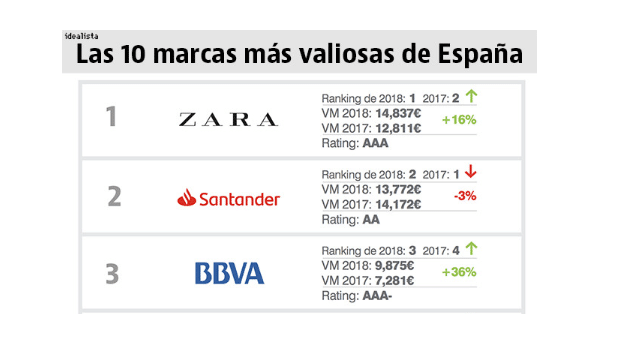 Desde la inmobiliaria House Hunting, te informamos que el todopoderoso grupo Inditex ha espoleado a su buque insignia, Zara, a tal límite que ha logrado arrebatar el trono al Santander y desplazarlo al segundo escalón del pódium de los gigantes. El BBVA, por su parte, conserva la tercera posición, consigue mantenerse dentro del triunvirato.