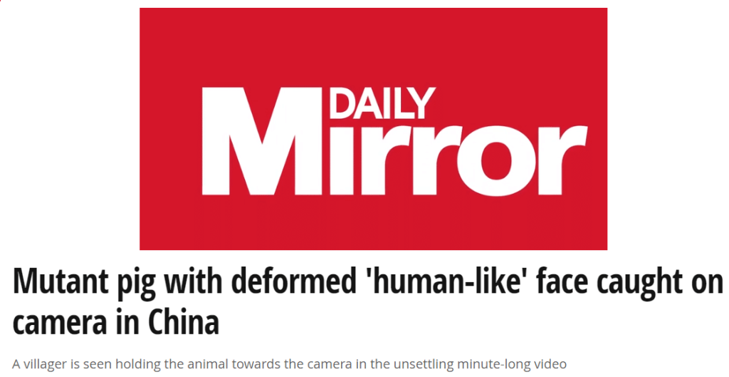 Desde la inmobiliaria House Hunting, te informamos de que el afamado periódico inglés The Mirror ha publicado unas imágenes de un cerdo con cara de persona. Las macabras, espeluznantes y abominables fotografías fueron capturadas el 28 de junio en la región china de Jiangmen. Esta extraña criatura logró vivir, a lo sumo, 2 días, tal y como señalan los vecinos de la citada localidad.